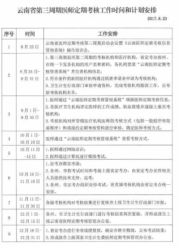 关于开展云南省2017年第三周期医师定期考核的定考安排