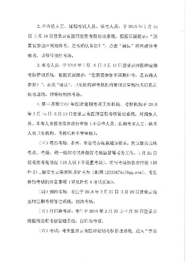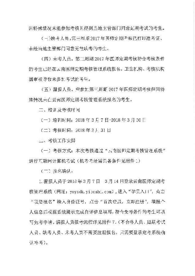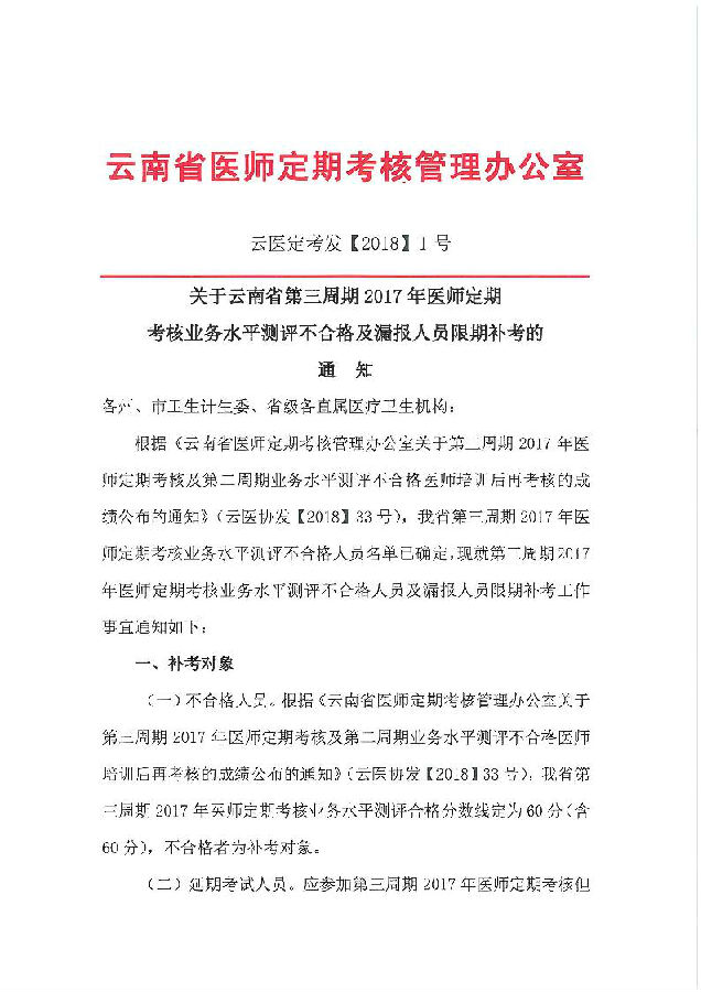 云医定考发【2018】1号-关于云南省第三周期2017年医师定期考核业务水平测评不合格及漏报人员限期补考的通知