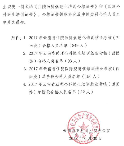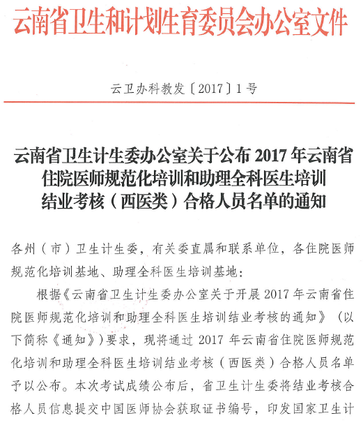 云南省卫生计生委办公室关于公布2017年云南省住院医师规范化培训和助理全科医生培训结业考核(西医类)合格人员名单的通知