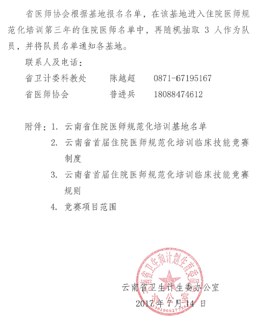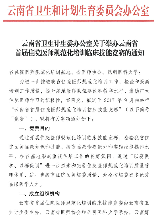 云南省卫生计生委办公室关于举办云南省首届住院医师规范化培训临床技能竞赛的通知