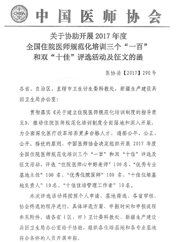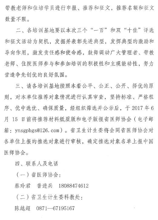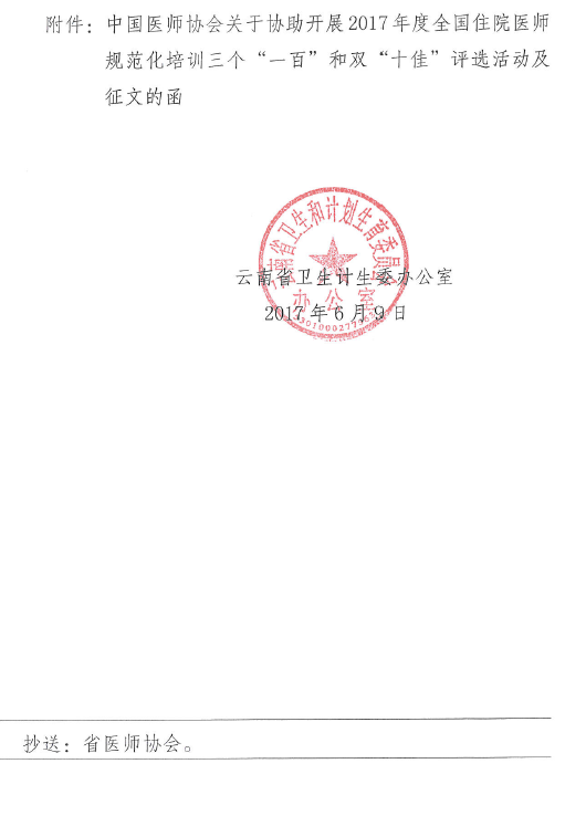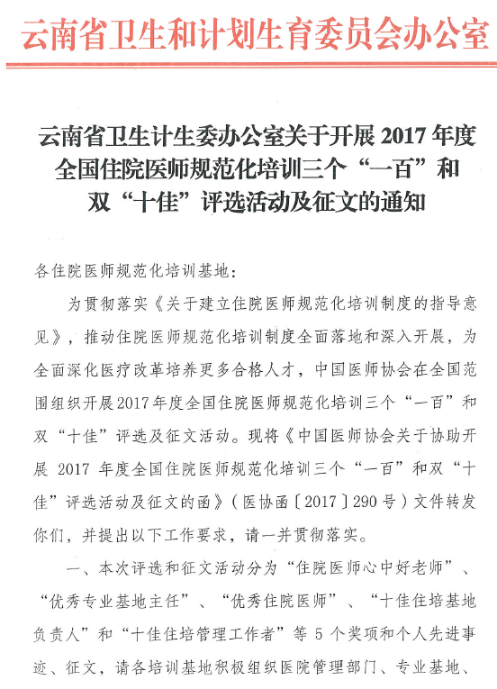 云南省卫生计生委办公室关于开展2017年度全国住院医师规范化培训三个“一百”和双“十佳”评选活动及征文的通知