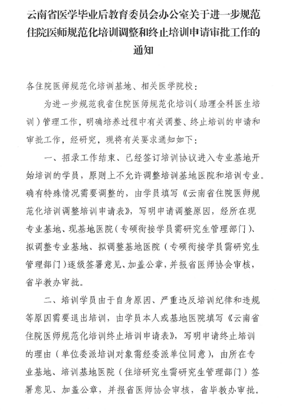云南省医学毕业后教育委员会办公室关于进一步规范住院医师规范化培训调整和终止培训申请审批工作的通知.pdf