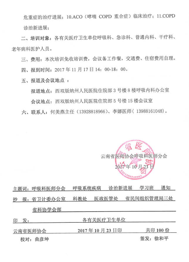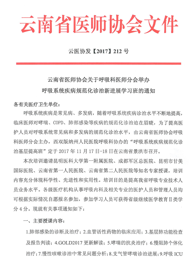 云南省医师协会关于呼吸科医师分会举办呼吸系统疾病规范化诊治新进展学习班的通知