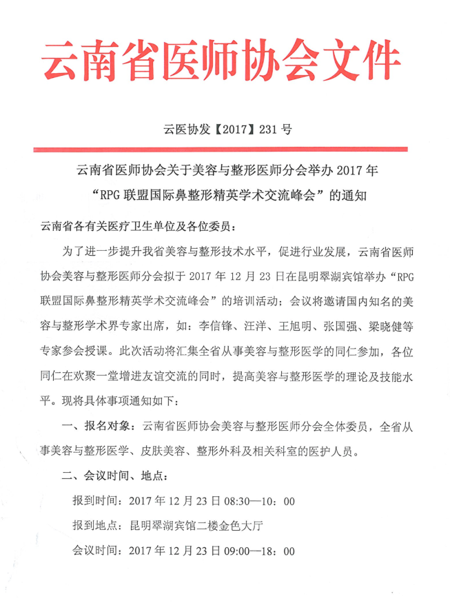 美容与整形医师分会举办2017年“RPG联盟国际鼻整形精英学术交流峰会”的通知