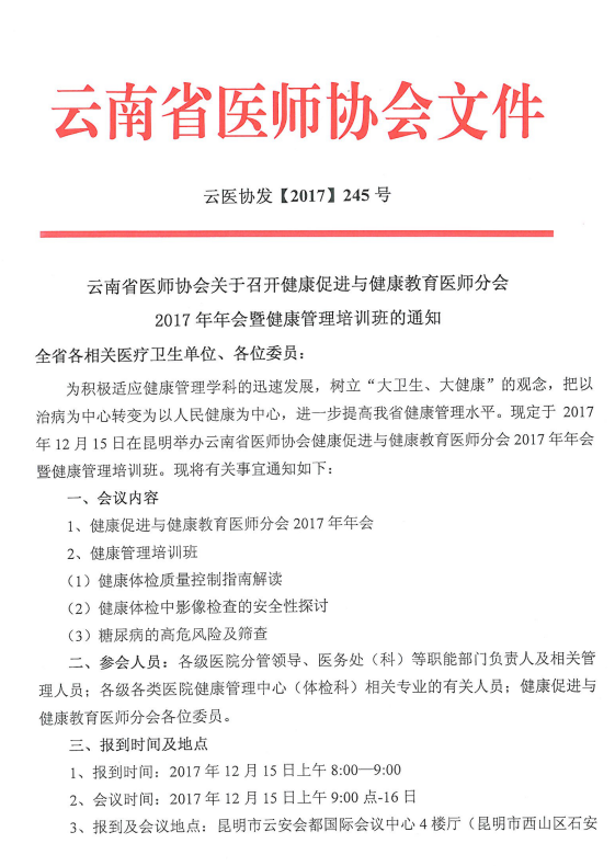 关于召开健康促进与健康教育医师分会2017年年会暨健康管理培训的通知