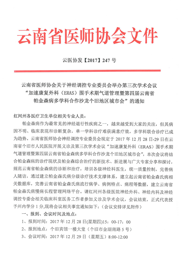 神经调控专业委员会举办第三次学术会议“加速康复外科(ERAS)围手术期气道管理暨第四届云南省帕金森病多学科合作沙龙个旧地区城市会”的通知.pdf