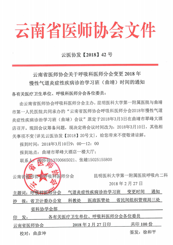 云南省医师协会关于呼吸科医师分会变更2018年慢性气道炎症性疾病诊治学习班(曲靖)会议时间的通知.pdf