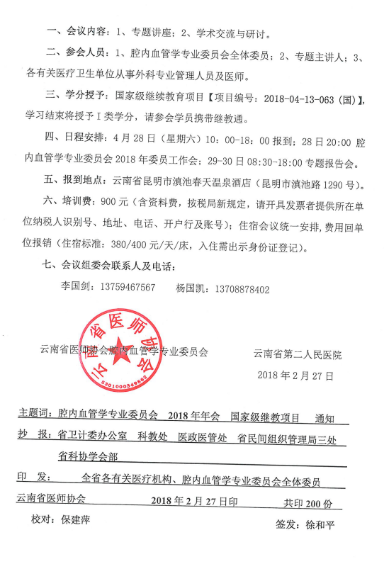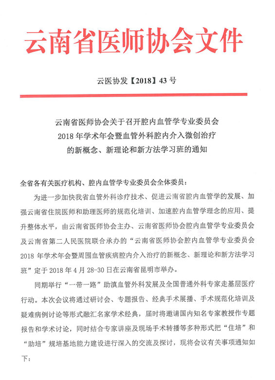 云南省医师协会关于召开腔内血管学专业委员会2018年学术年会的通知