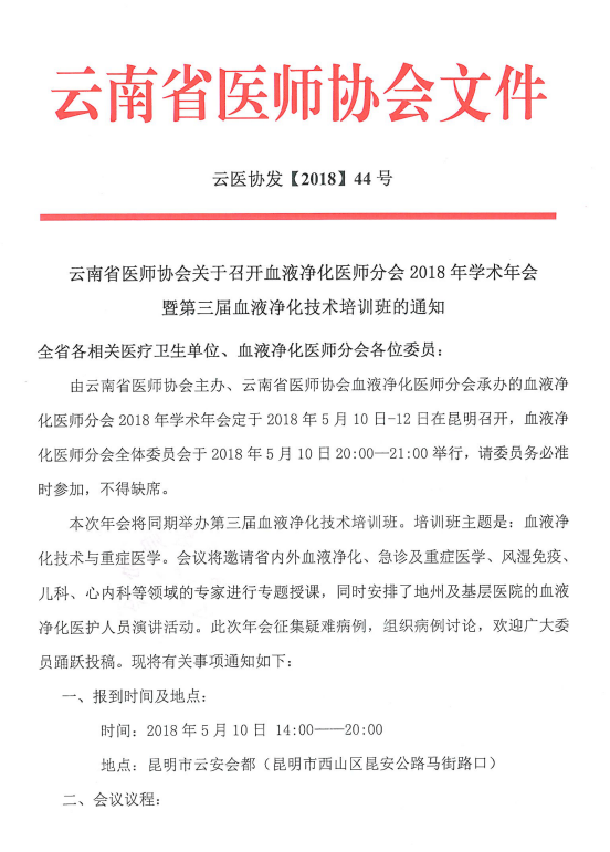 云南省医师协会关于召开腔内血管学专业委员会2018年学术年会的通知