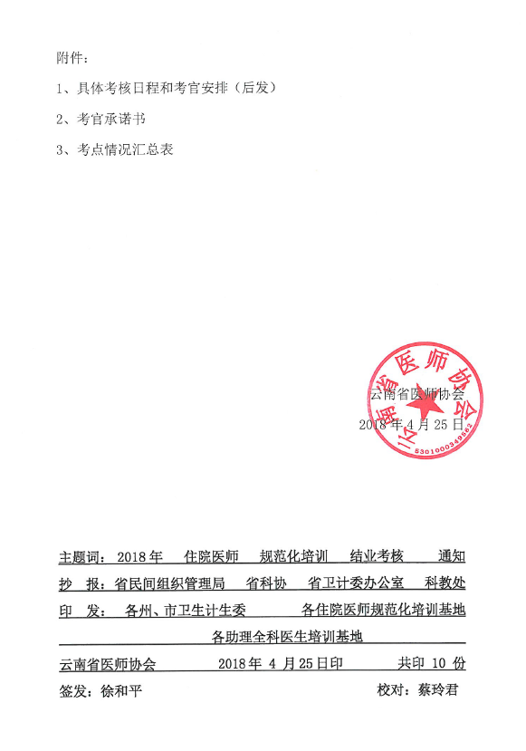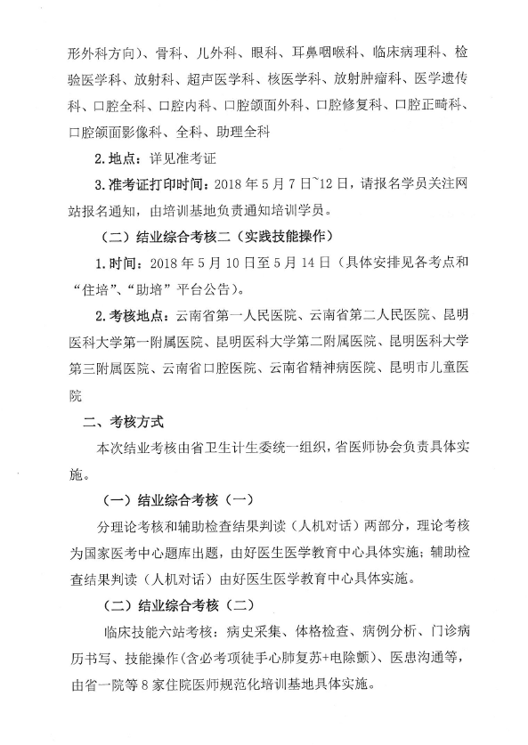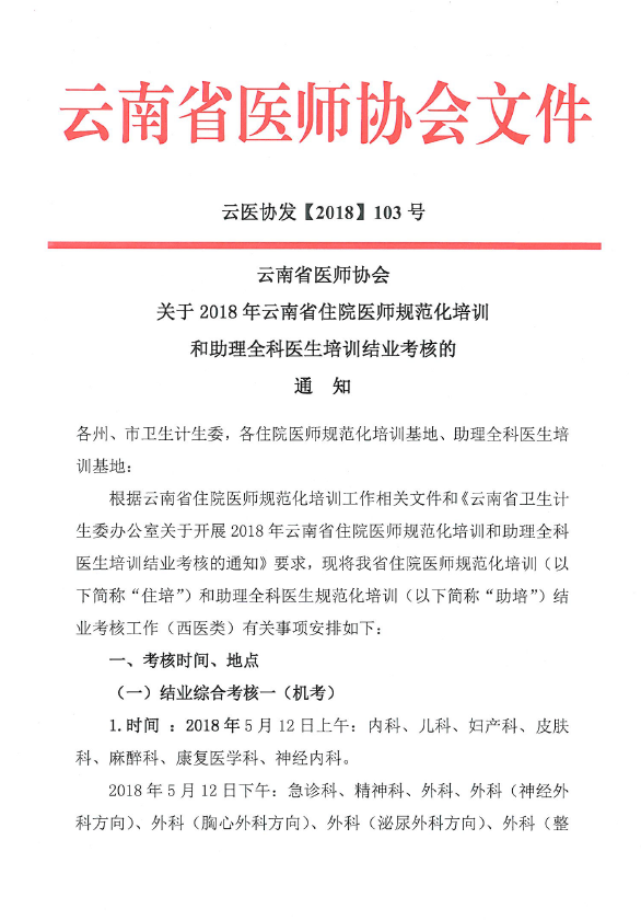 103号-云南省医师协会关于2018年住院医师规范化培训和助理全科医生培训结业考核的通知