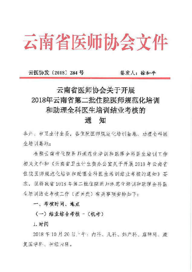 云医协发【2018】284 号-云南省医师协会关于开展2018年云南省第二批住院医师规范化培训和助理全科医生培训结业考核的通知