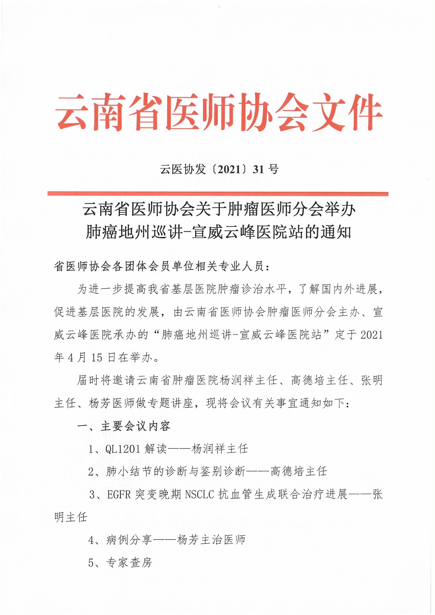 31号-云南省医师协会关于肿瘤医师分会举办肺癌地州巡讲-宣威云峰医院站的通知