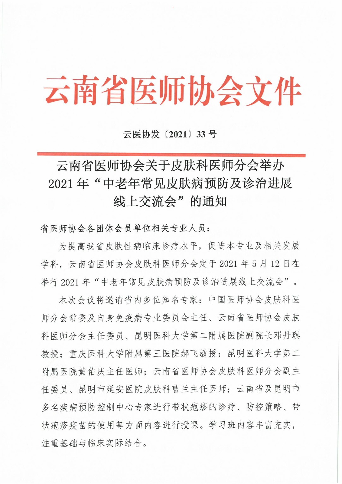 33号-云南省医师协会关于皮肤科医师分会举办2021年“中老年常见皮肤病预防及诊治进展线上交流会”的通知.pdf