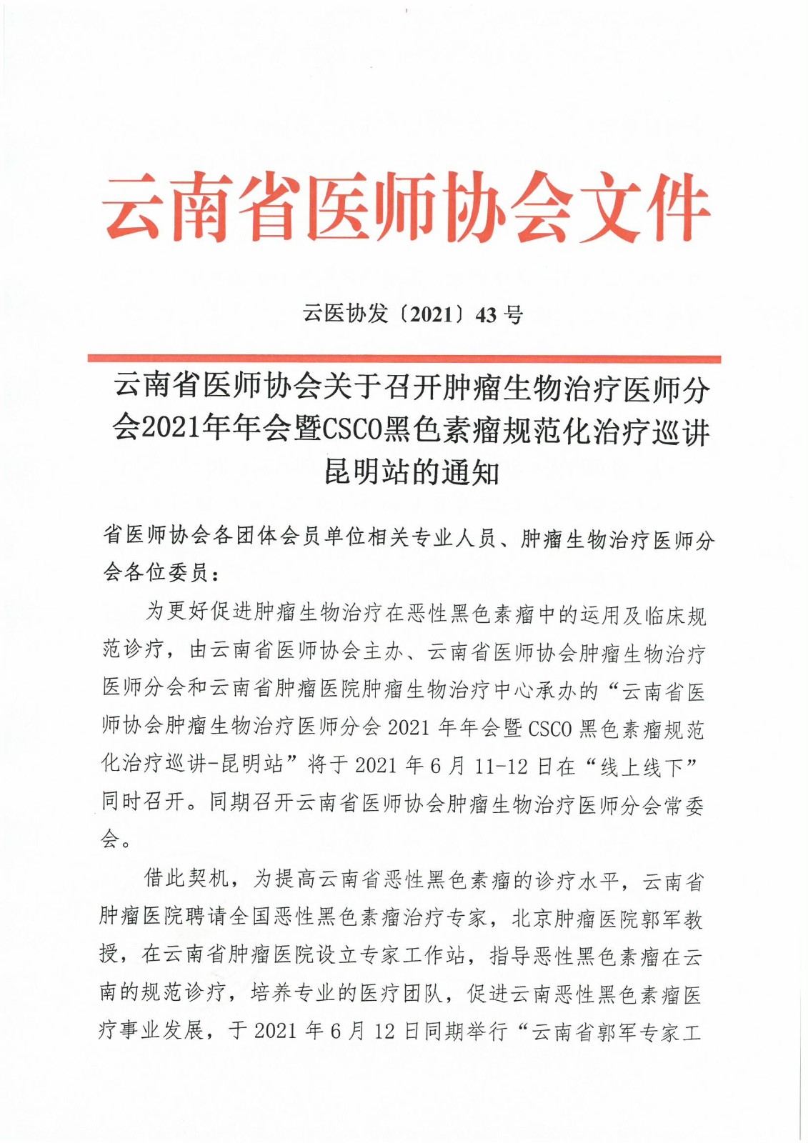 43号-云南省医师协会肿瘤生物治疗医师分会2021年年会暨2021年CSCO黑色素瘤规范化治疗巡讲-昆明站