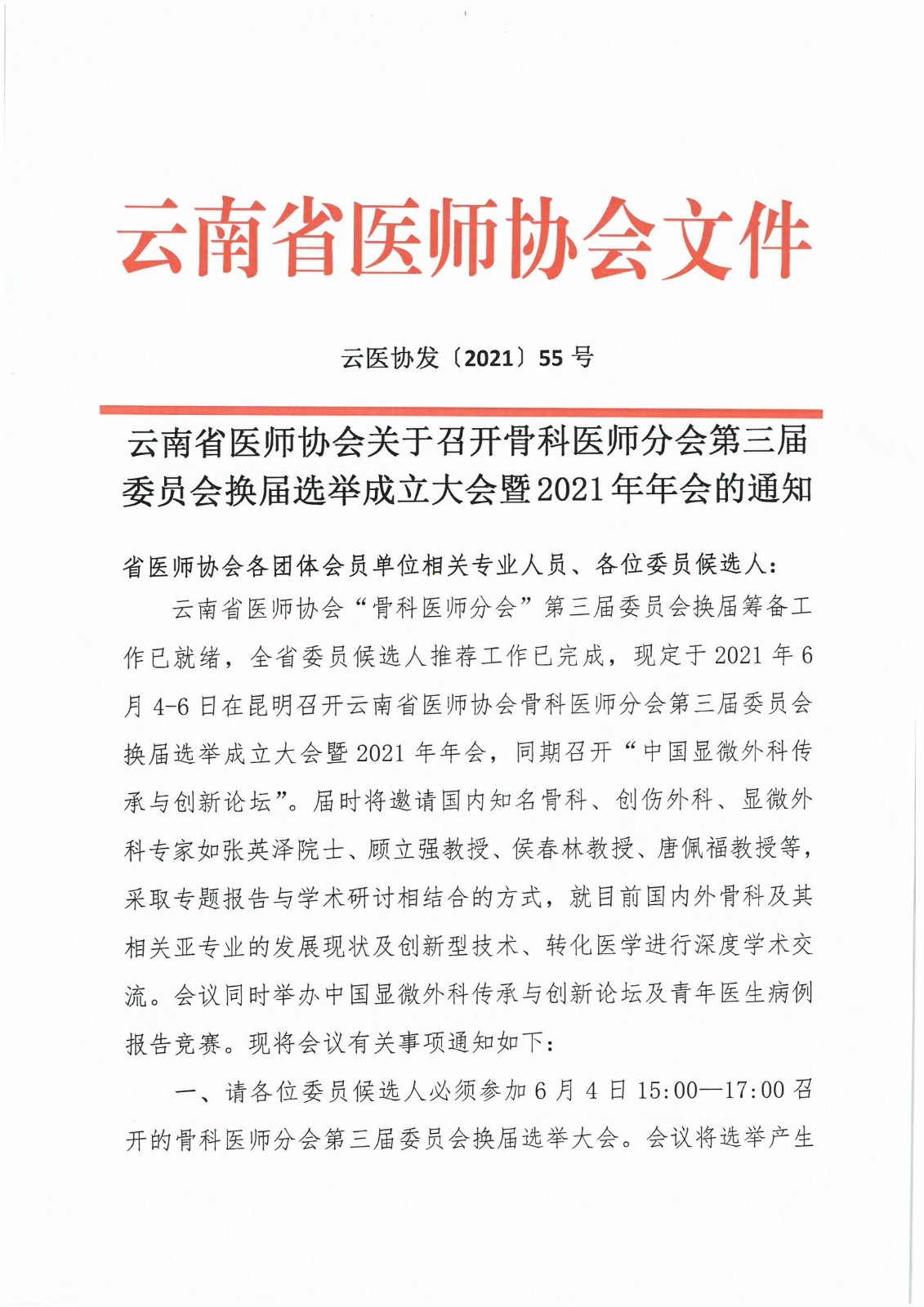 55号-云南省医师协会关于召开骨科医师分会第三届委员会换届选举成立大会暨2021年年会的通知