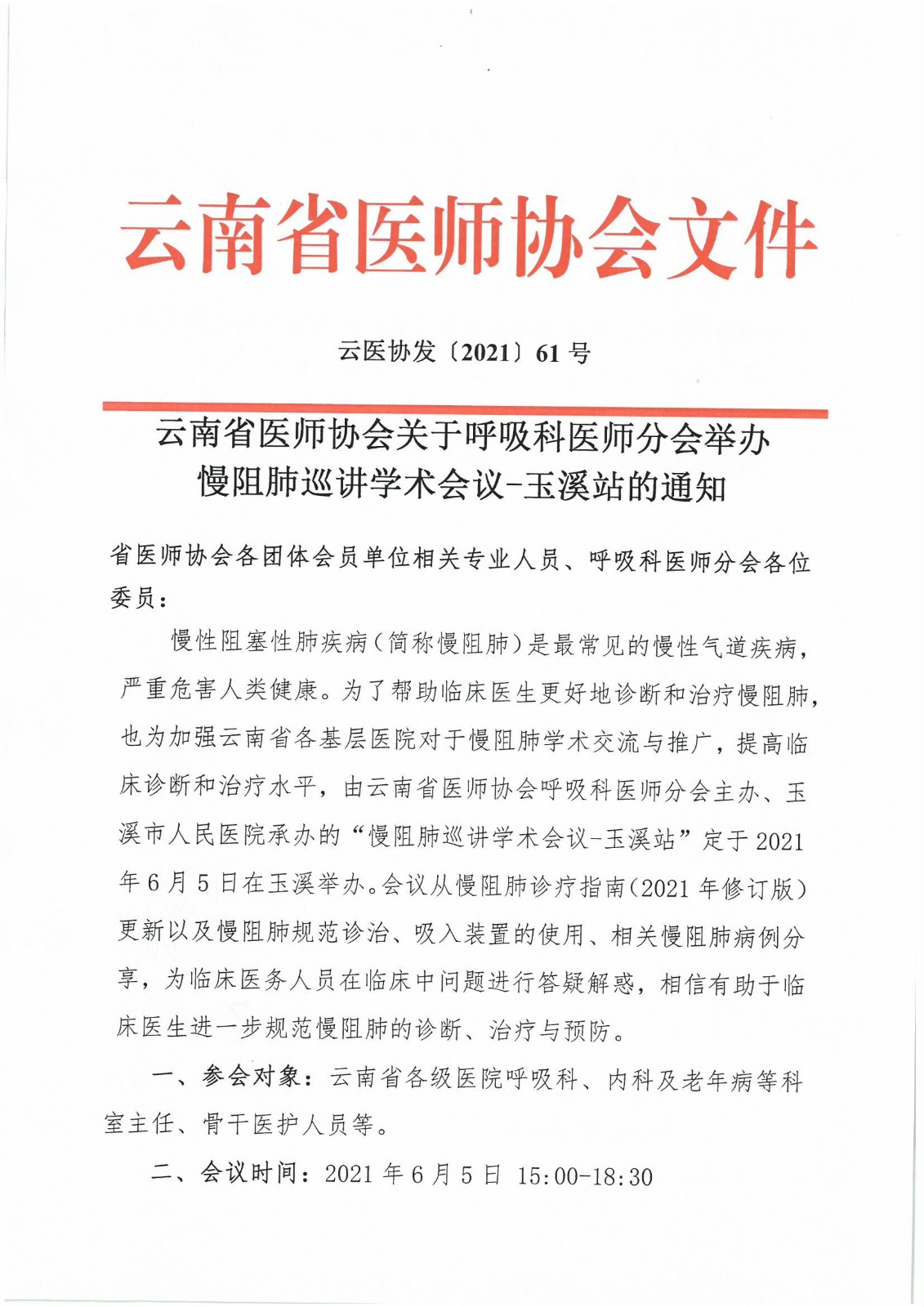61号红头-云南省医师协会关于呼吸科医师分会举办慢阻肺巡讲学术会议-玉溪站的通知.pdf