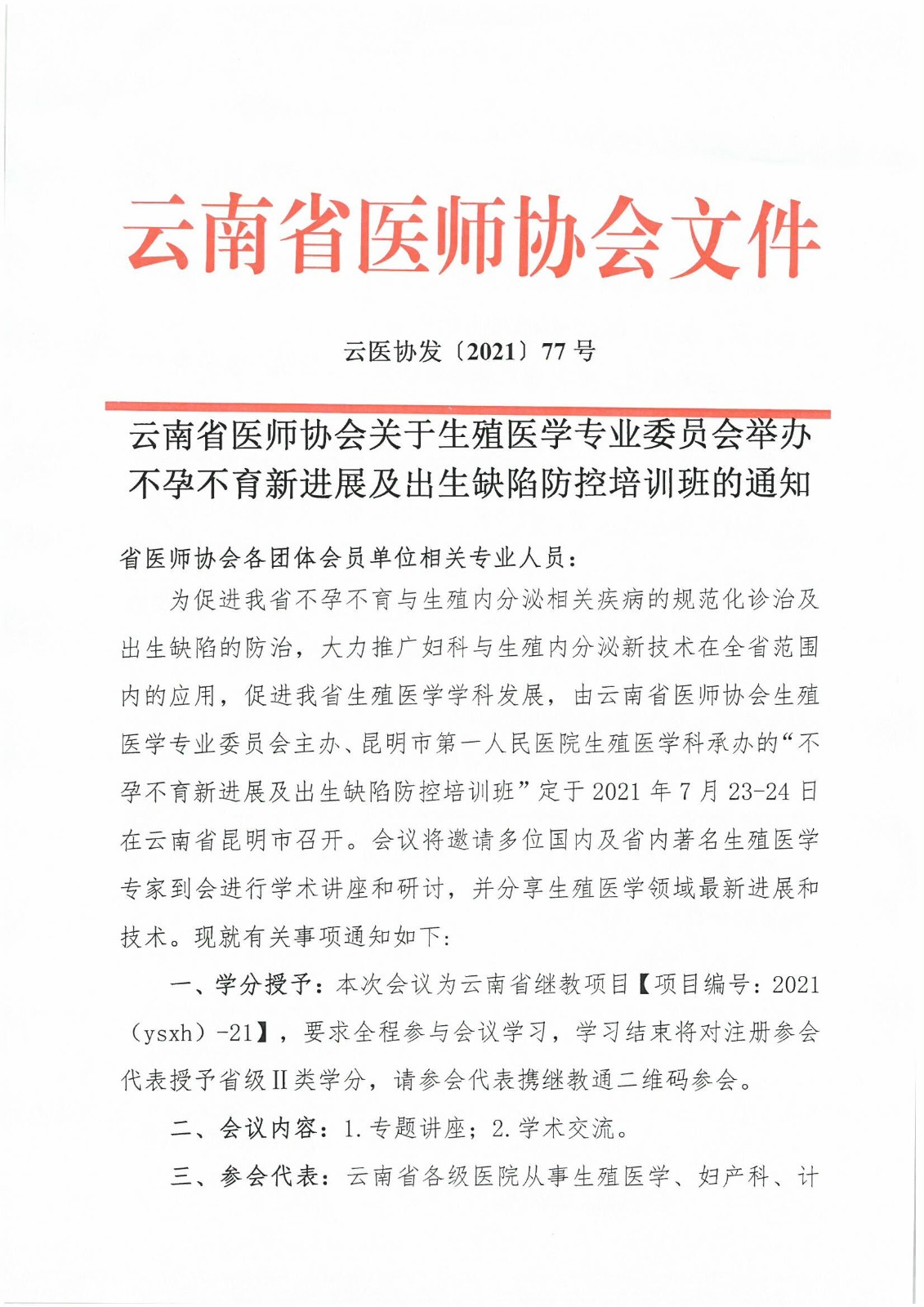 77号红头-云南省医师协会关于生殖医学专业委员会举办不孕不育新进展及出生缺陷防控培训班的通知.pdf