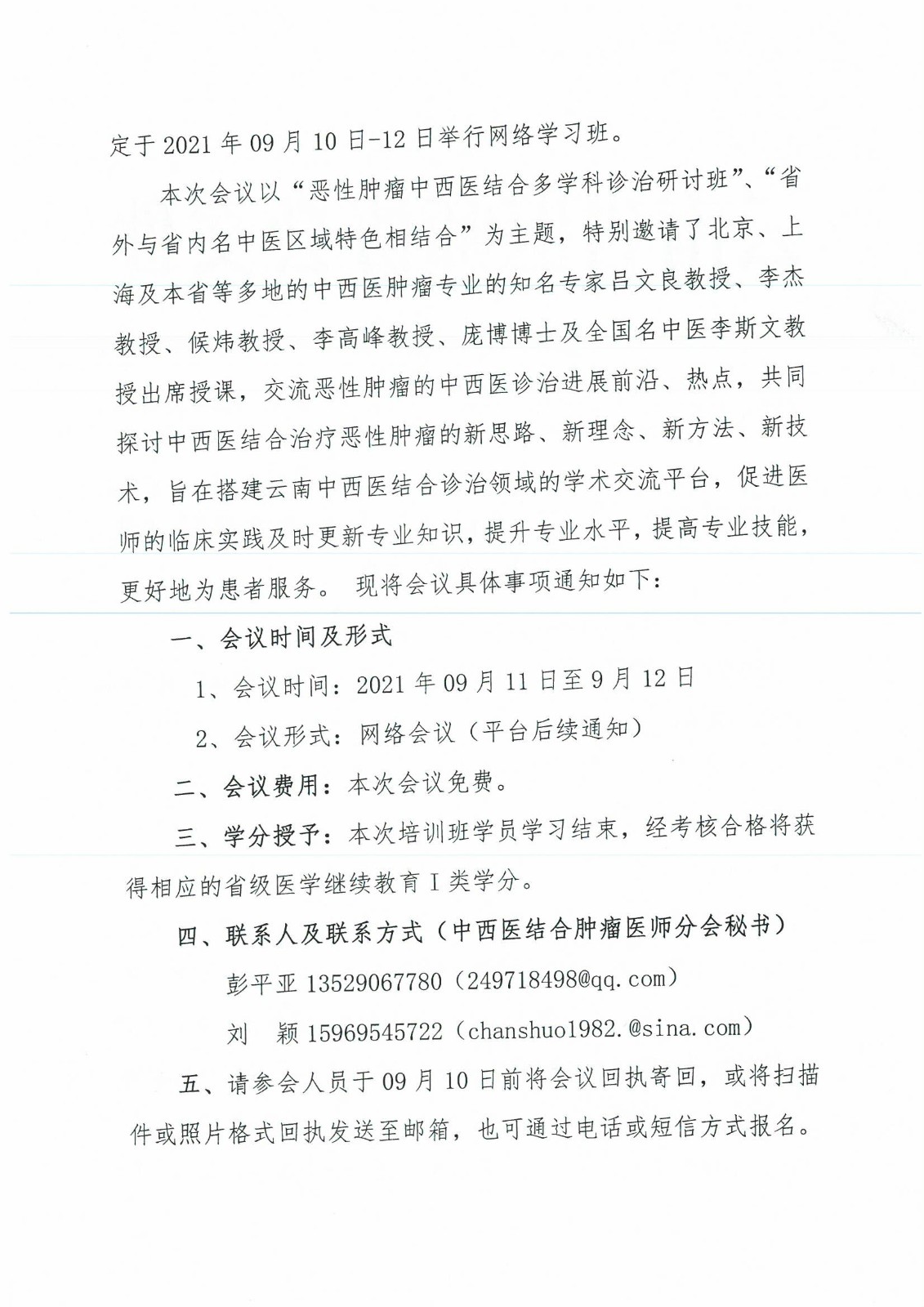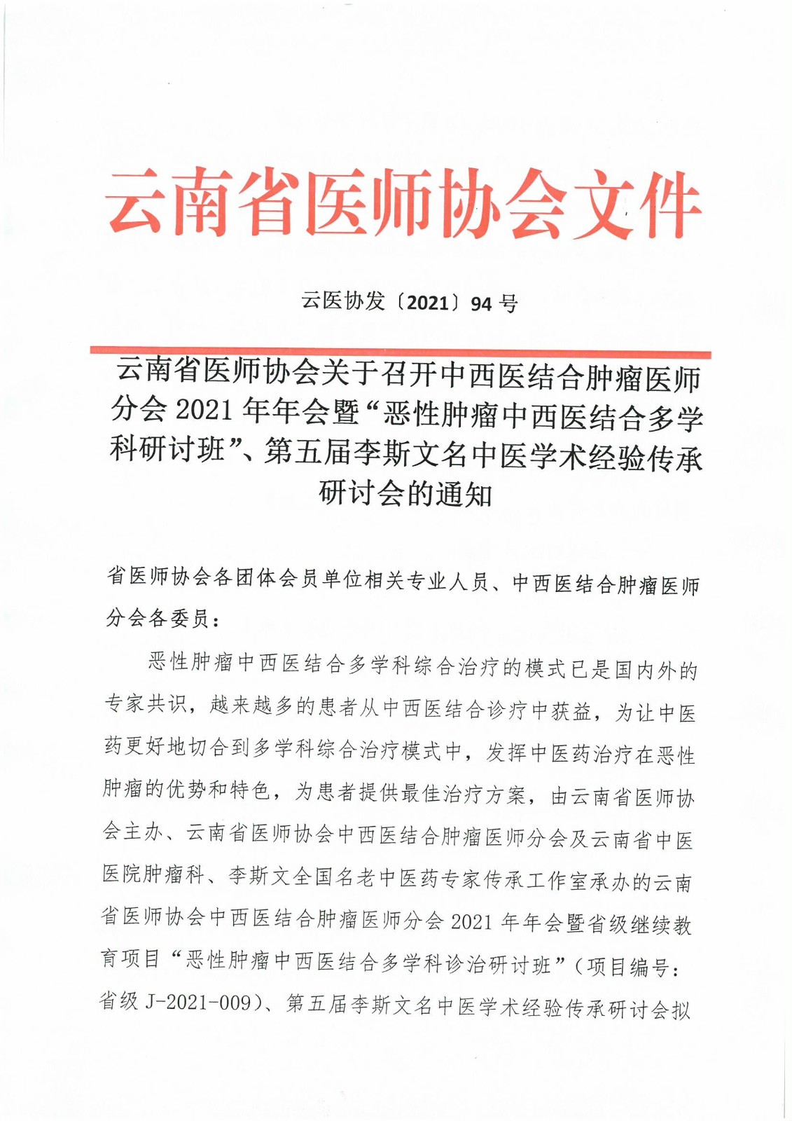 94号红头-云南省医师协会关于召开中西医结合肿瘤医师分会2021年年会暨“恶性肿瘤中西医结合多学科研讨班”、第五届李斯文名中医学术经验传承研讨会的通知.pdf