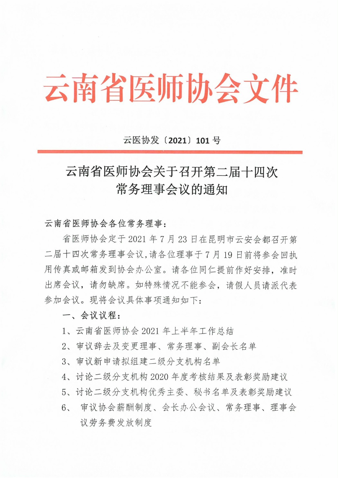 101号-云南省医师协会关于召开第二届十四次常务理事会议的通知