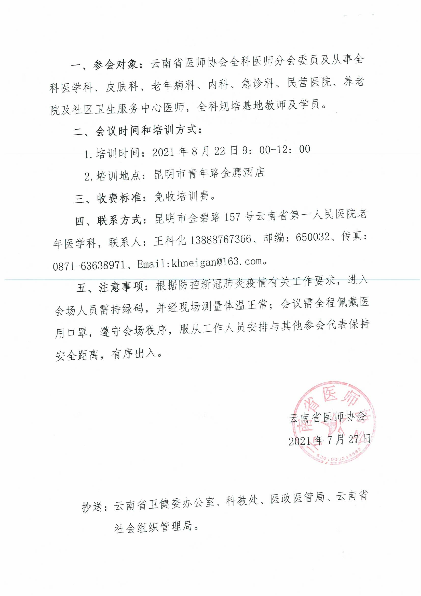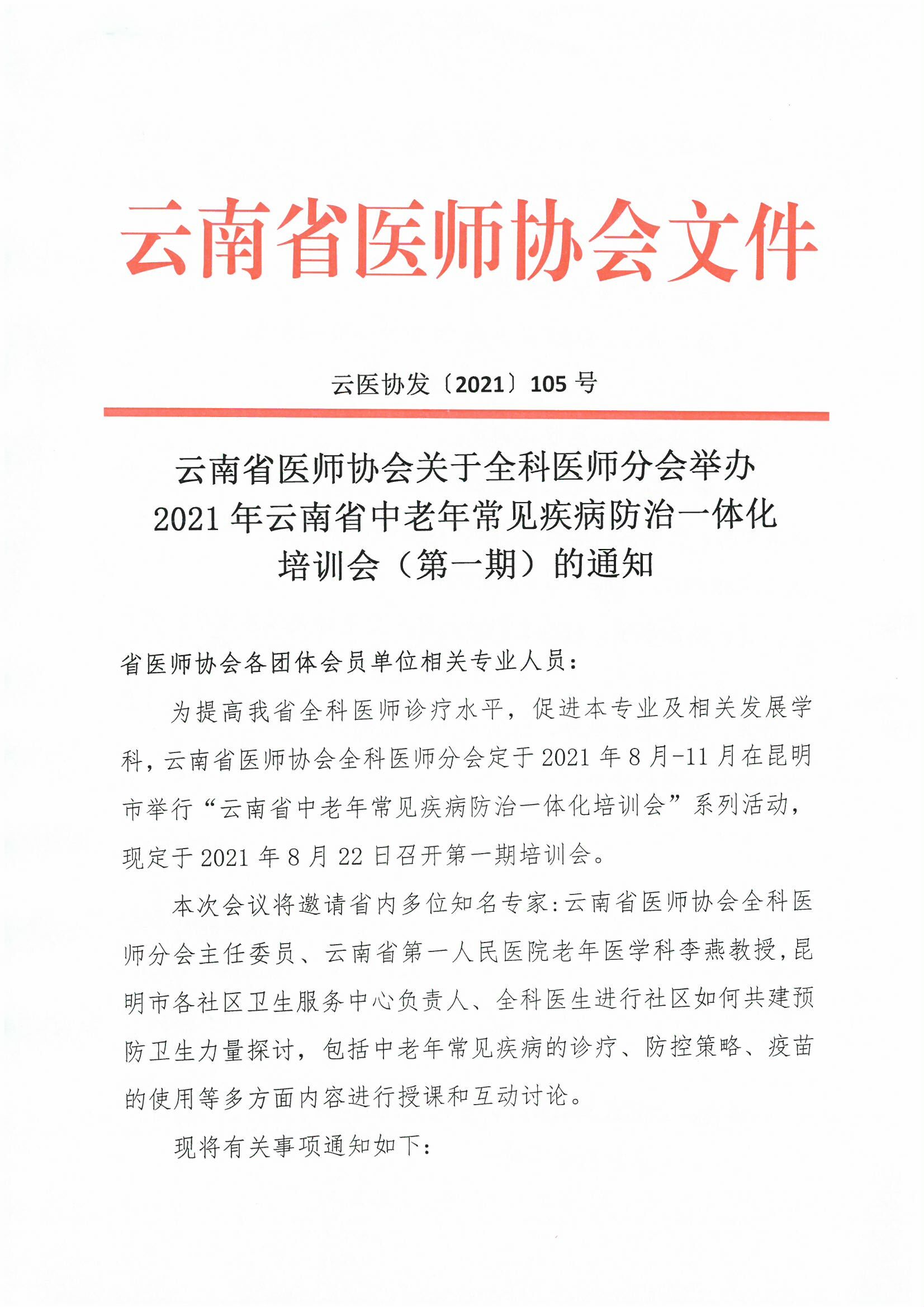 105号-云南省医师协会关于全科医师分会举办2021年云南省中老年常见疾病防治一体化培训会(第一期)的通知