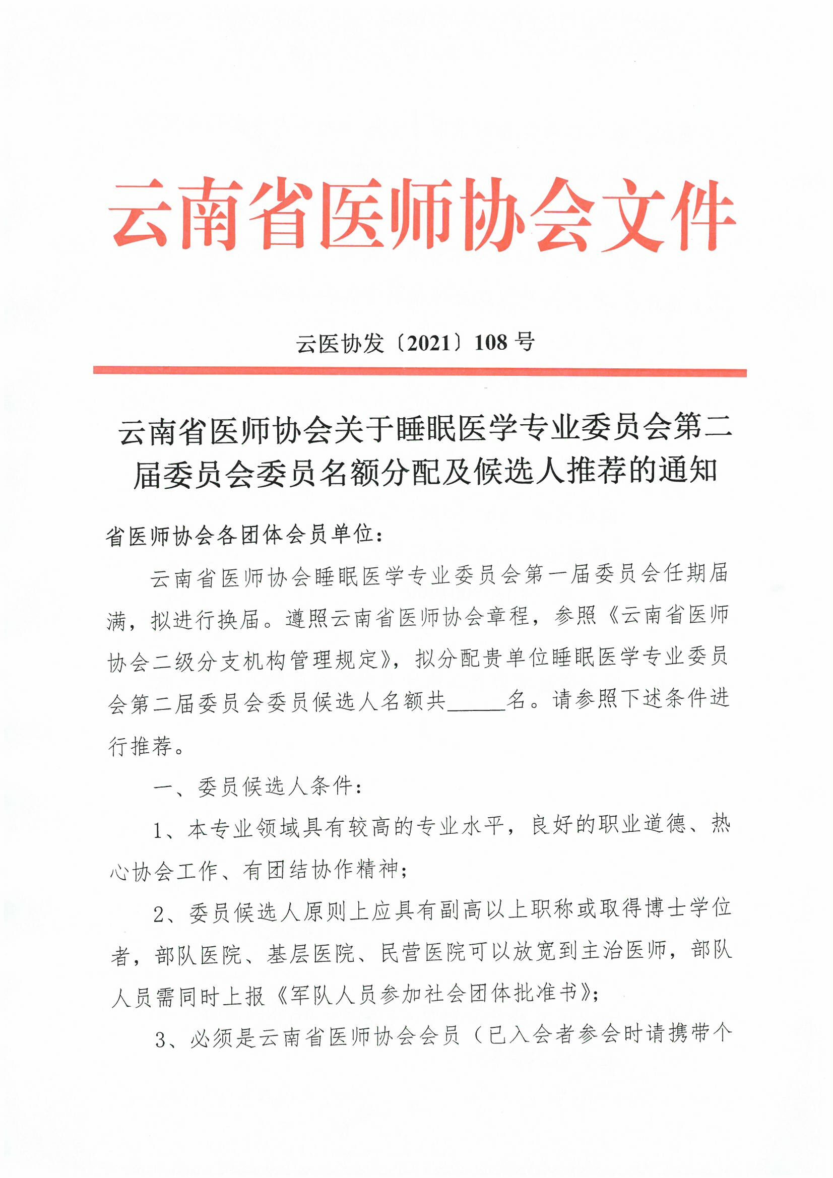 108号红头-云南省医师协会关于睡眠医学专业委员会第二届委员会委员名额分配及候选人推荐的通知.pdf