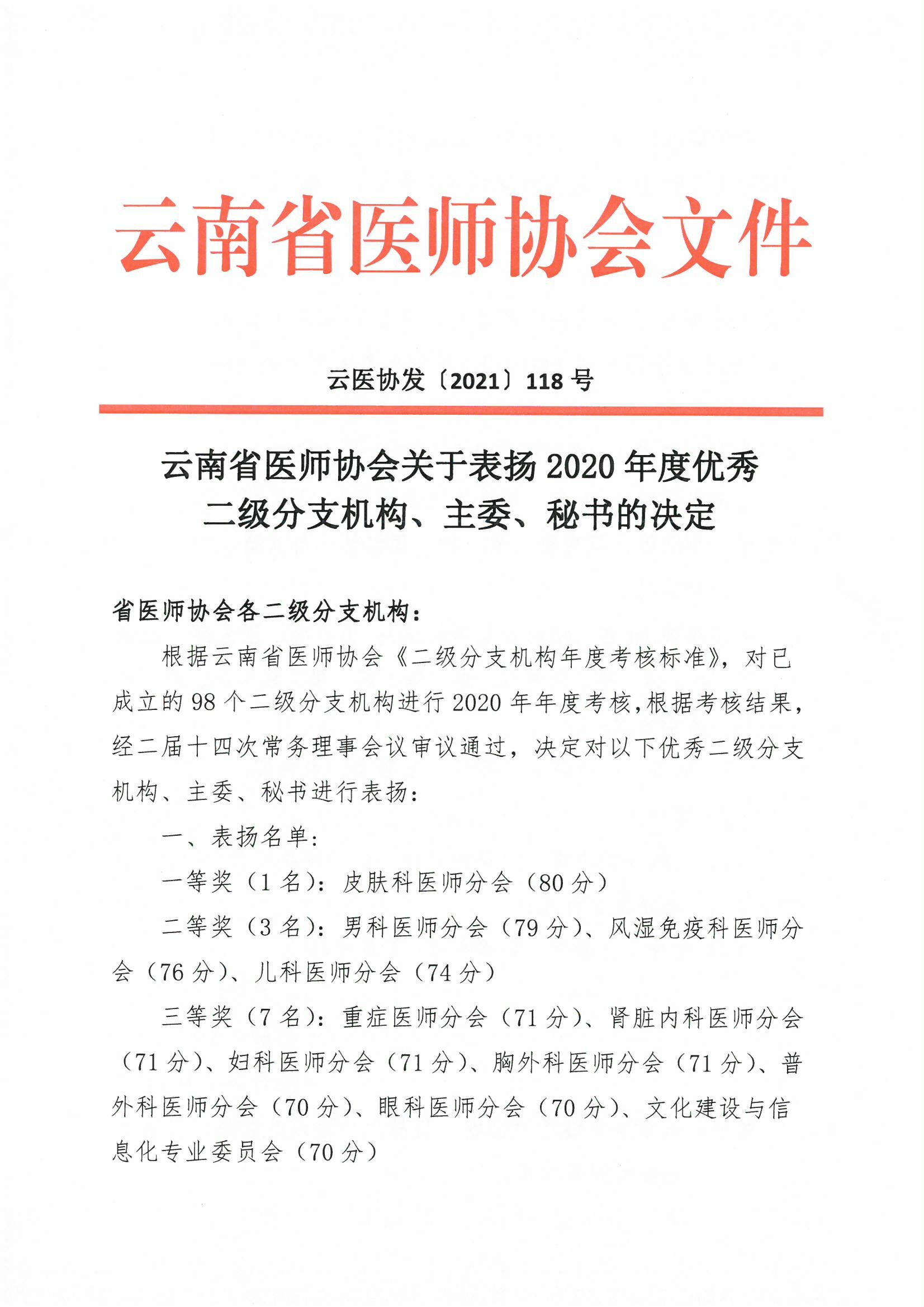 118号-云南省医师协会关于表扬2020年度优秀二级分支机构、主委、秘书的决定