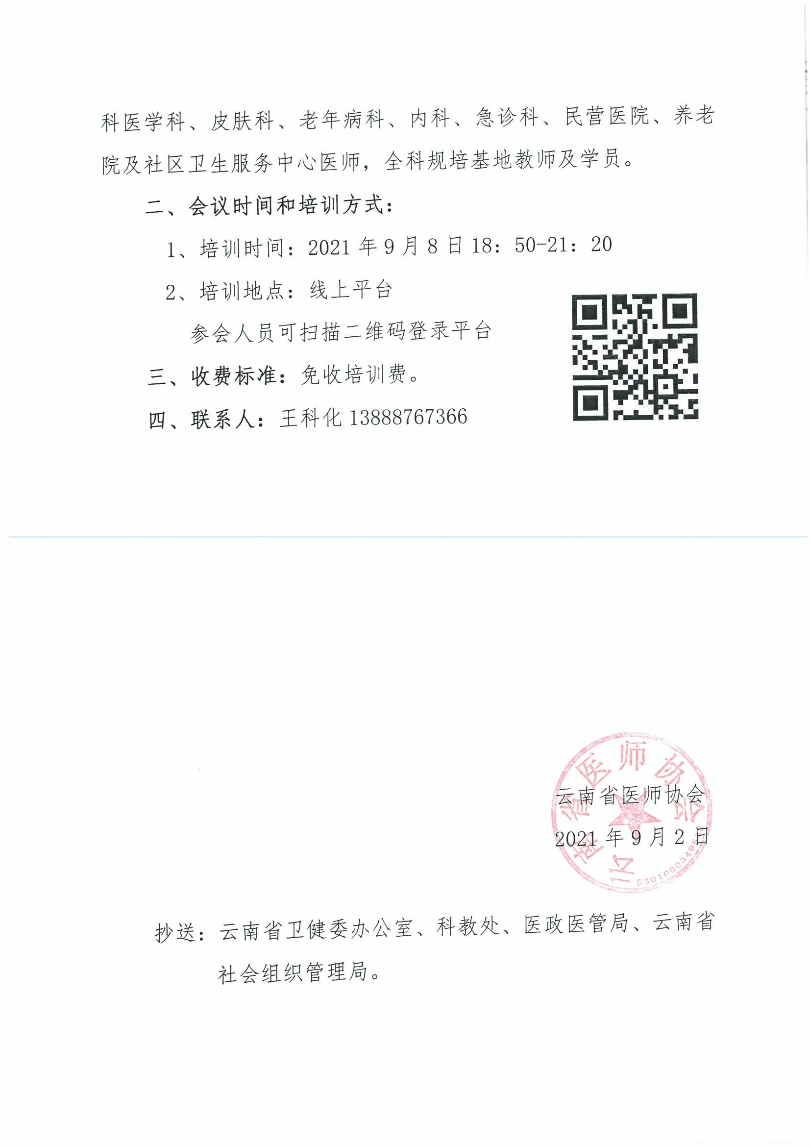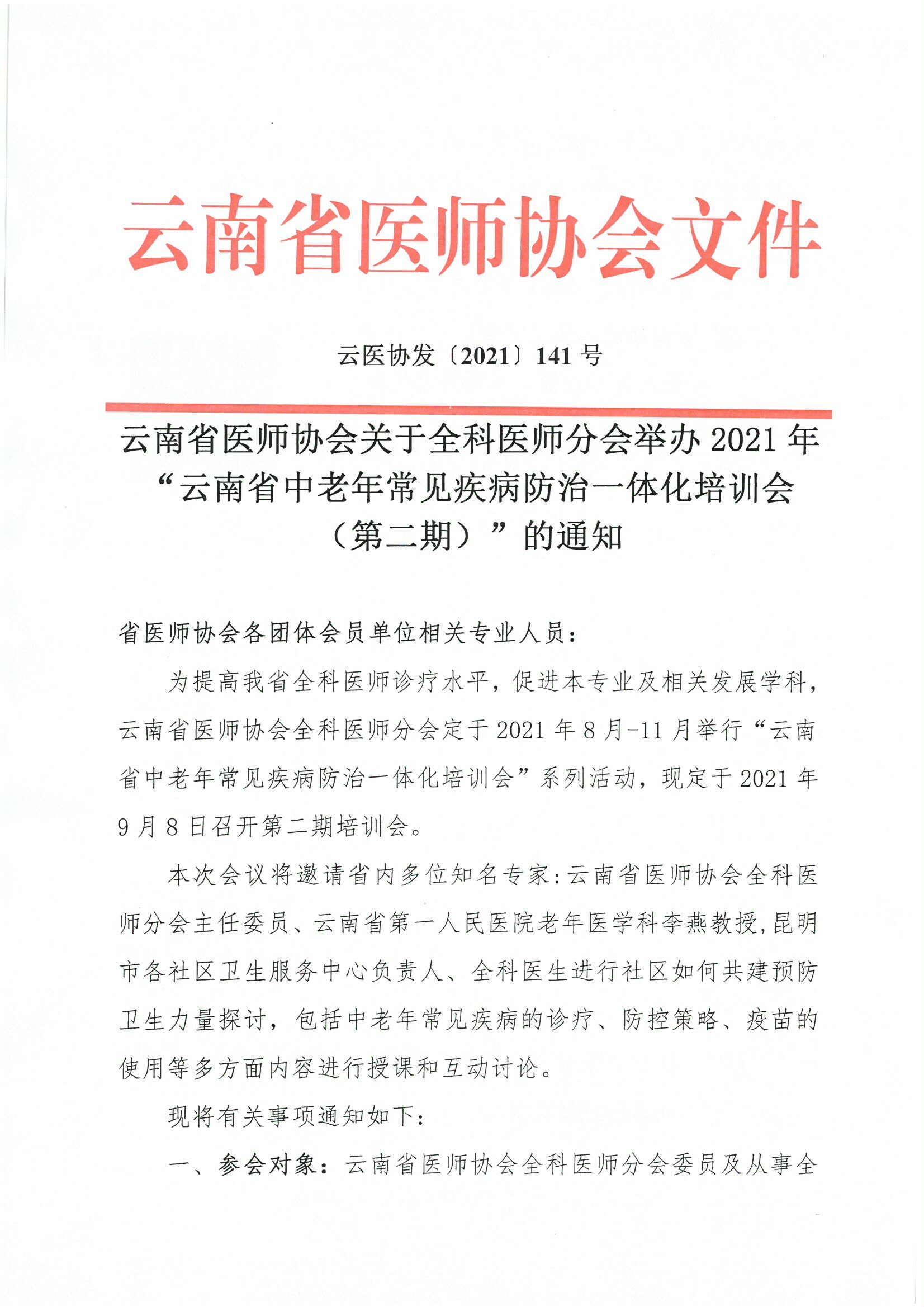 141号-云南省医师协会关于全科医师分会举办2021年“云南省中老年常见疾病防治一体化培训会(第二期)”的通知