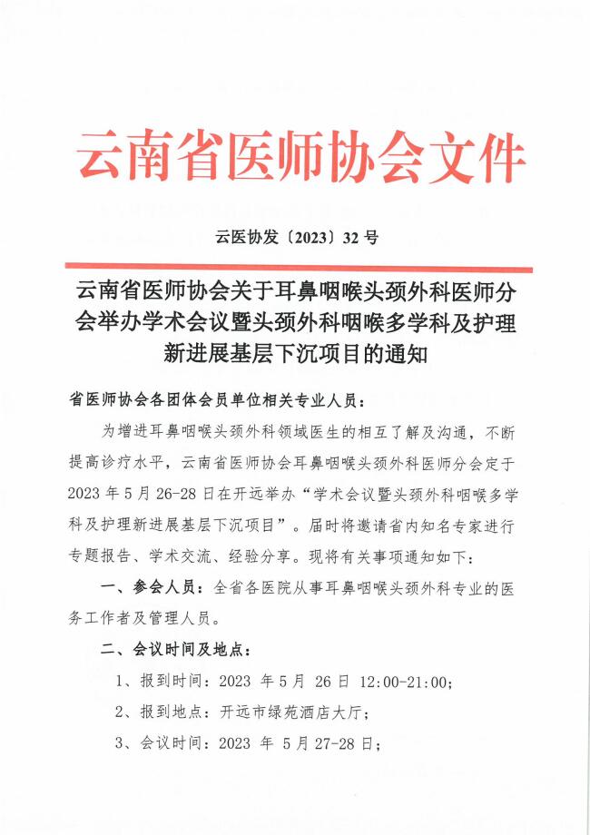 32号-云南省医师协会关于耳鼻咽喉头颈外科医师分会举办学术会议的通知
