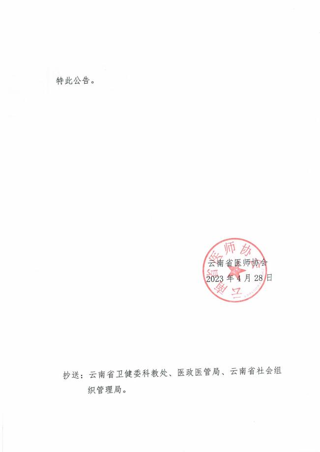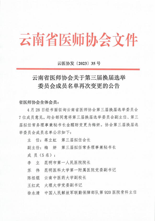 35号-云南省医师协会关于第三届换届选举委员会成员名单再次变更的公告