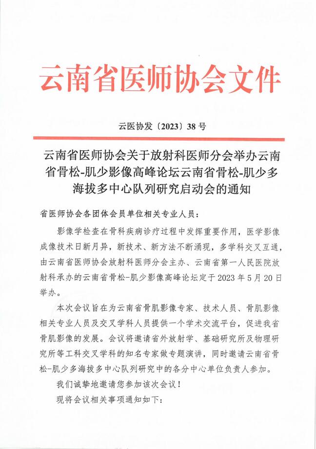 38号-云南省医师协会关于放射科医师分会举办云南省骨松-肌少影像高峰论坛云南省骨松-肌少多海拔多中心队列研究启动会的通知