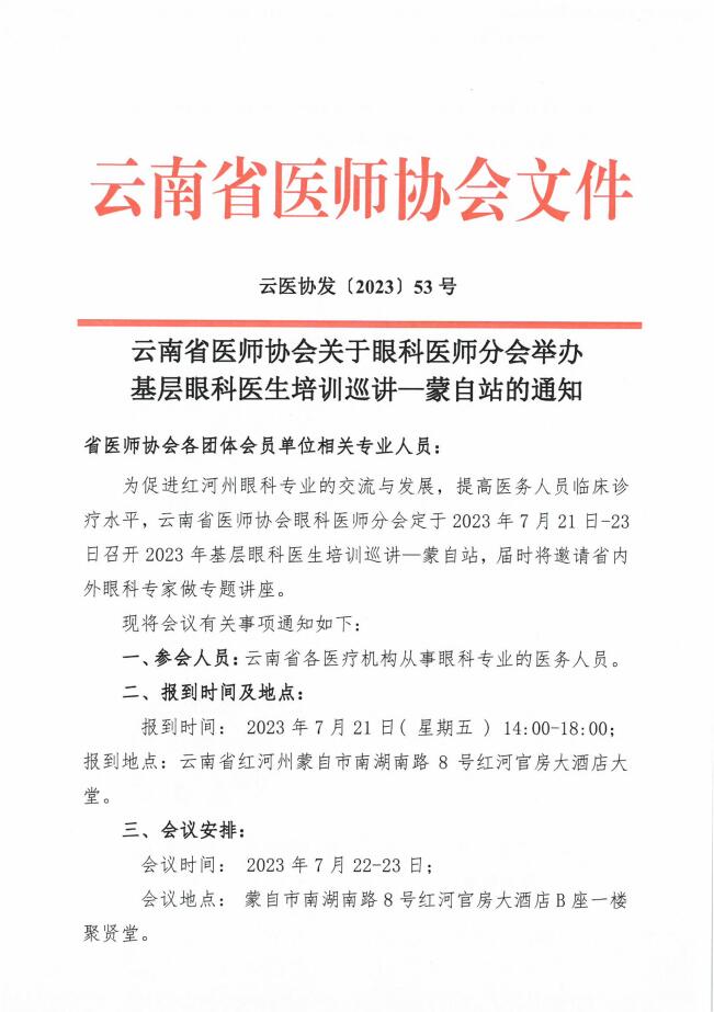 53号-云南省医师协会关于眼科医师分会举办基层眼科医生培训巡讲—蒙自站的通知