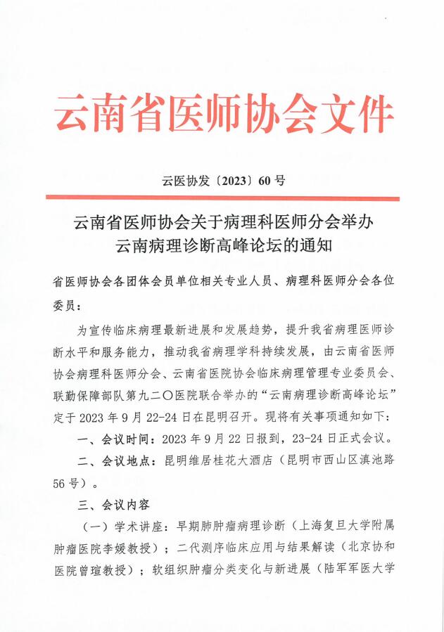 60号-云南省医师协会关于病理科医师分会举办云南病理诊断高峰论坛的通知
