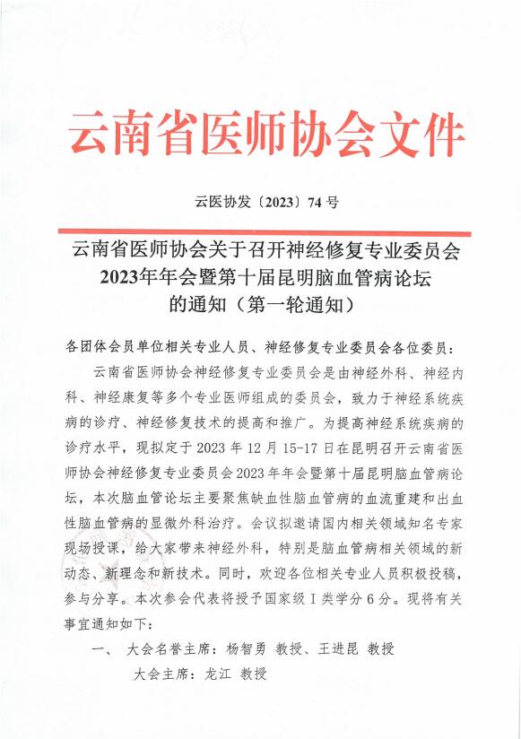 74号-云南省医师协会关于召开神经修复专业委员会2023年年会暨第十届昆明脑血管病论坛的通知(第一轮通知).pdf