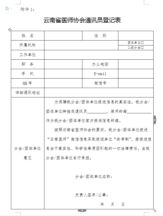 云南省医师协会通讯员登记表.doc