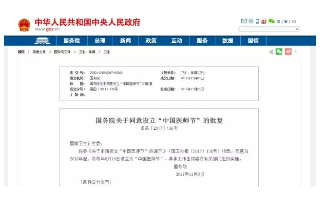 值得欣慰的是,2017年11月3日,中国政府网发布消息称:国务院批复国家卫生计生委同意设立“中国医师节”,自2018年起,将每年8月19日设立为“中国医师节”!