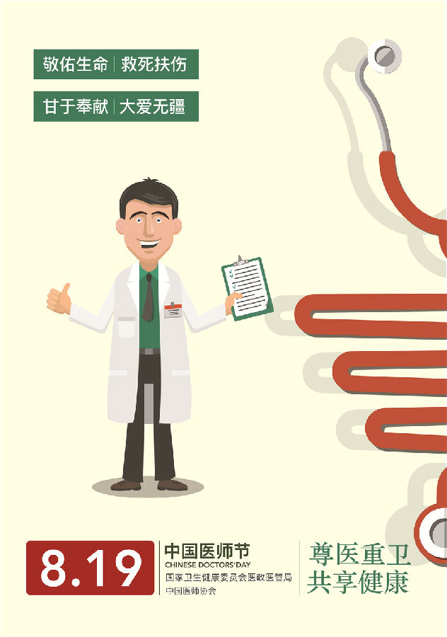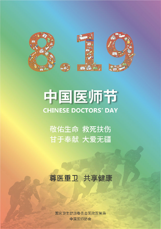 经国务院批准,自2018年起将每年8月19日设立为“中国医师节”。为组织开展好首个中国医师节系列活动,进一步彰显党和政府对广大医师和医务人员的关爱和厚望,大力弘扬“敬佑生命、救死扶伤、甘于奉献、大爱无疆”的卫生健康崇高精神,营造全社会尊医重卫的良好氛围,国家卫生健康委员会医政医管局联合中国医师协会制作了两幅宣传画。