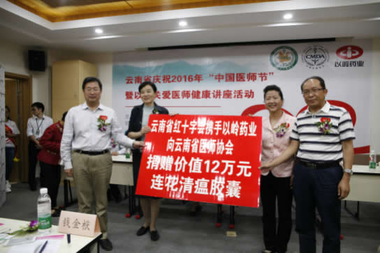 以岭药业全国总经理刘庆京表示:希望可以通过给医师送健康服务,为促进人民群众健康、构建和谐社会做一些实实在在的事情。希望在社会各界人士的共同努力下,必定会有越来越多的公益力量加入进来,共同推进这项爱心事业。会上云南省红十字会及以岭药业向参会的医师捐赠药品、药枕和健康保健书籍,向被评为“人文医生”的4人颁发慰问金,以实际行动表示对医师的关爱和崇敬!