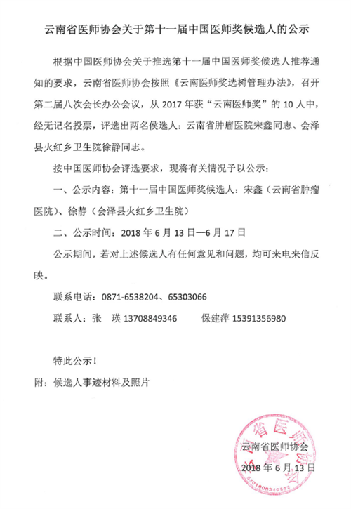 云南省医师协会关于第十一届中国医师奖候选人的公示