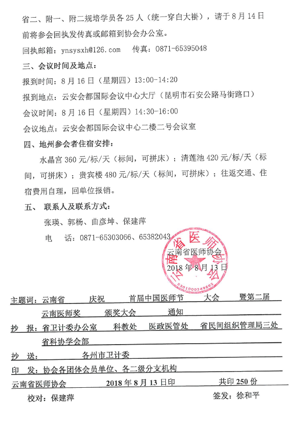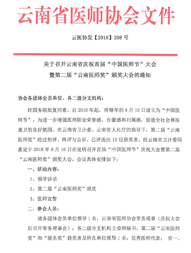 208号云南省医师协会关于首届“中国医师节”庆祝大会暨第二届“云南医师奖”颁奖大会的通知