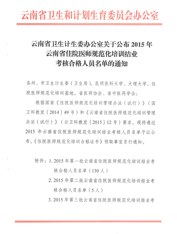 云南省卫生计生委办公室关于公布2015年云南省住院医师规范化培训结业考核合格人员名单的通知