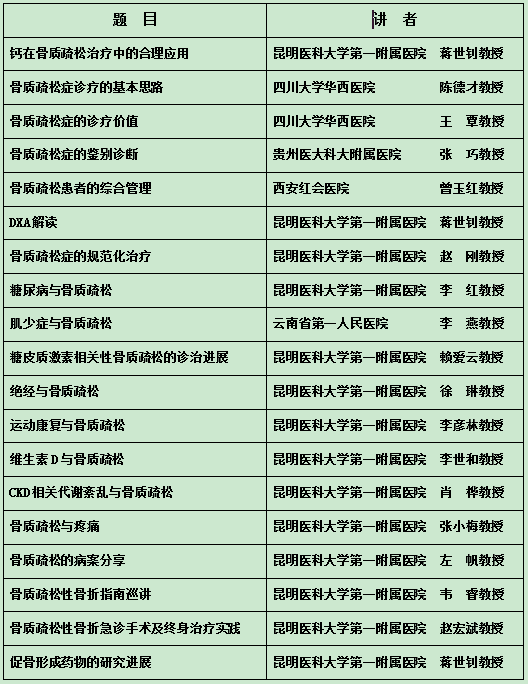 经云南省医师协会批准,运动医学医师分会常委会讨论通过,现定于2016年10月13-14日在昆明召开“云南省医师协会运动医学医师分会骨质疏松及骨矿盐疾病学组成立会议”。各位学组成员必须参加,不得缺席,无故缺席者将取消学组成员资格。同期将举办“骨质疏松症规范诊疗与诊治进展学习班”,届时将邀请国内知名专家开展学术交流,推动骨质疏松及骨矿盐疾病专业的发展(授课内容详见附件),会议结束授予I类学分。现就有关事项通知如下: