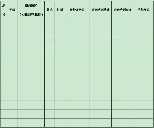 说明:1. 本表可由系统导出,导出程序:培训基地登录“省住培综合管理平台”,点击“报名招录”—分别点击“委托培养者”和“自主培养者”—“培训年级”—“报到状态”—右侧“excel”选项,选择相应项目后即可导出表格,导出的两张表合在一起即为本基地委托培养者和自主培养者信息。