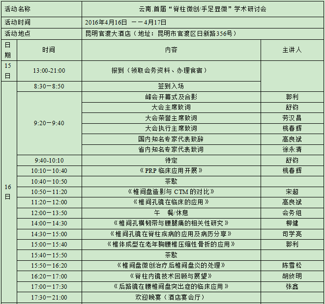 为进一步提高云南省从事骨科脊柱疾病、手足损伤疾病的专业人员的临床诊治能力及科研水平,同时,加强骨科医师分会委员之间的交流。由云南省医师协会骨科医师分会主办,昆明骨科医院承办的“云南.首届脊柱微创/手足显微学术研讨会” 于2016年4月16-17日在昆明举行。届时将邀请国内及我省知名专家就脊柱疾病微创、手足损伤显微治疗进行授课。现将有关事项通知如下: